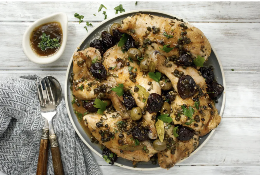 Transfer chicken to a platter and top with the olives, prunes, and capers from the pan.